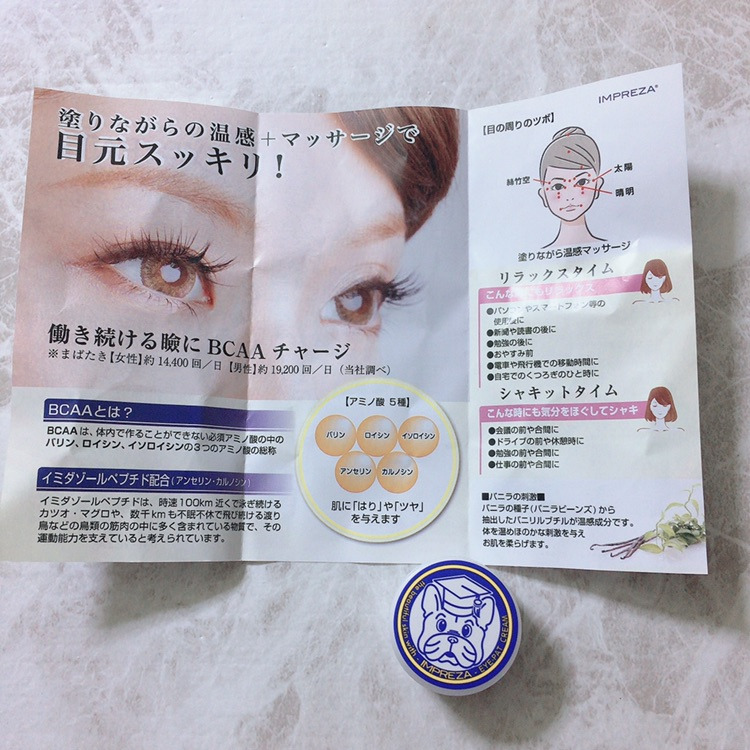 そして、必須アミノ酸のBCAAやイミダゾールペプチド配合で目元を保湿しながら温めてくれます。