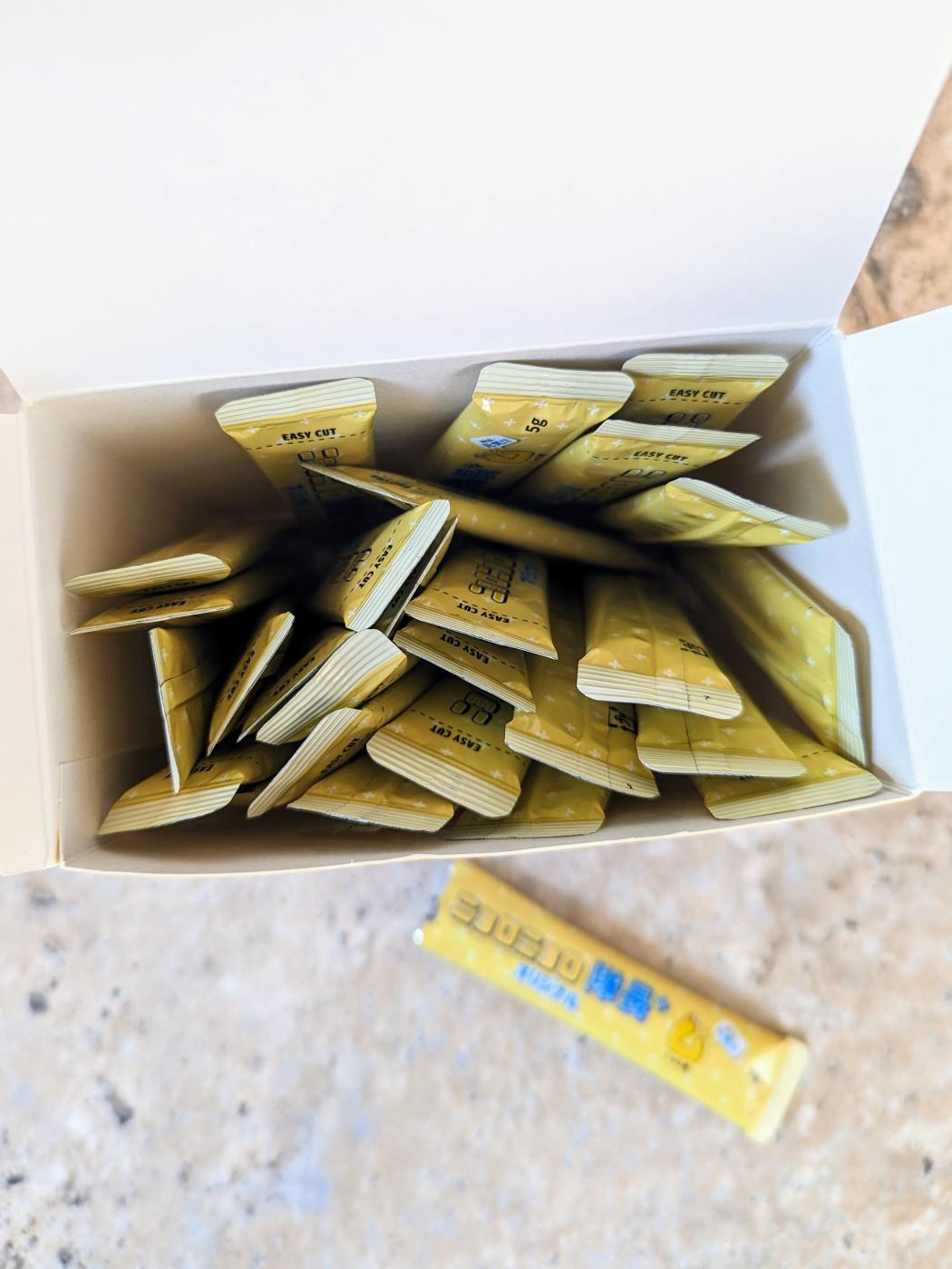 ニョロニョロ隊長+オリジナルは、黄色い可愛いイラスト付きのボックスの中に小分けで入っています。
