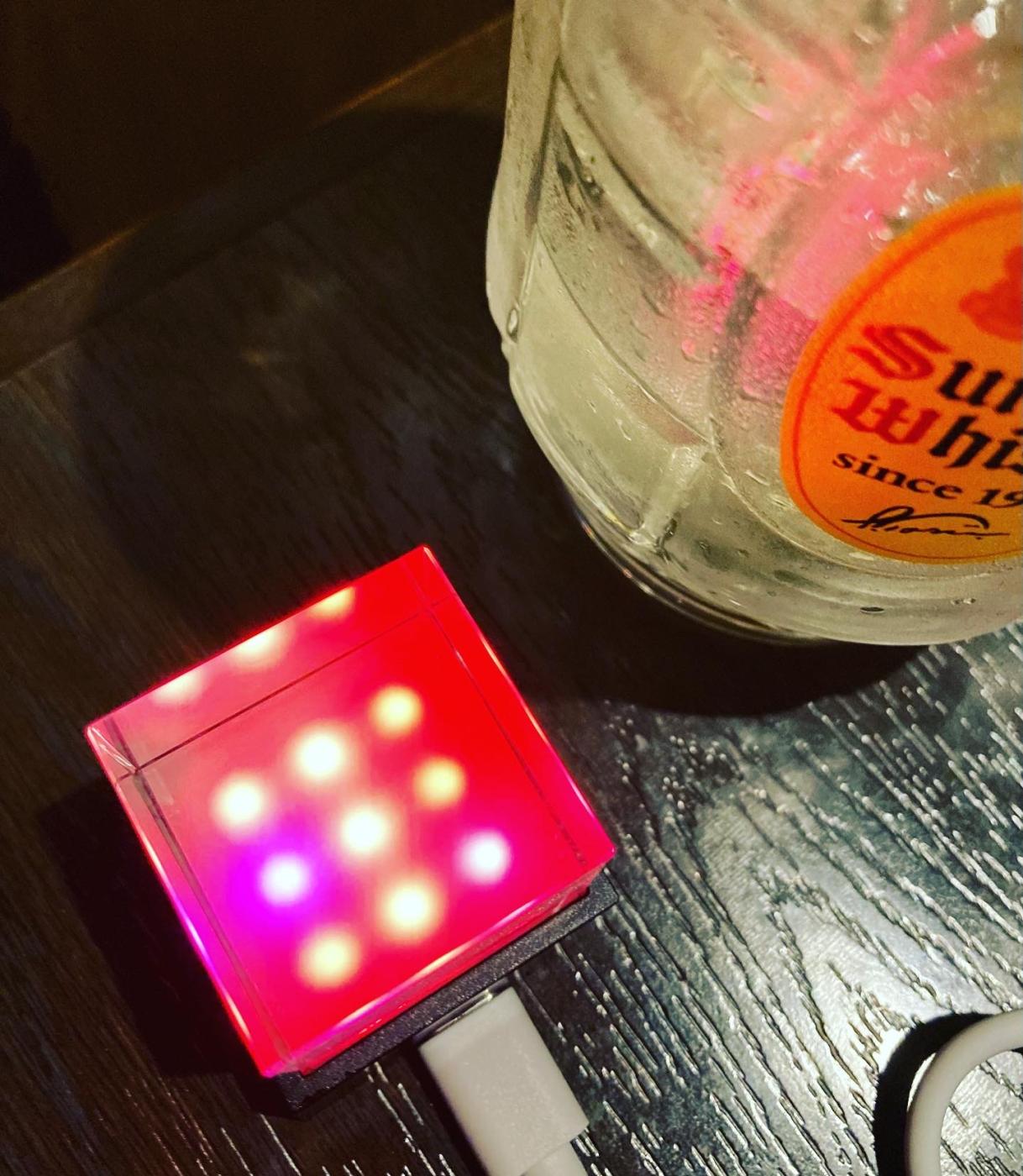 アクリルキューブの色はその程度に応じて緑~赤へと無段階で色が変化します。