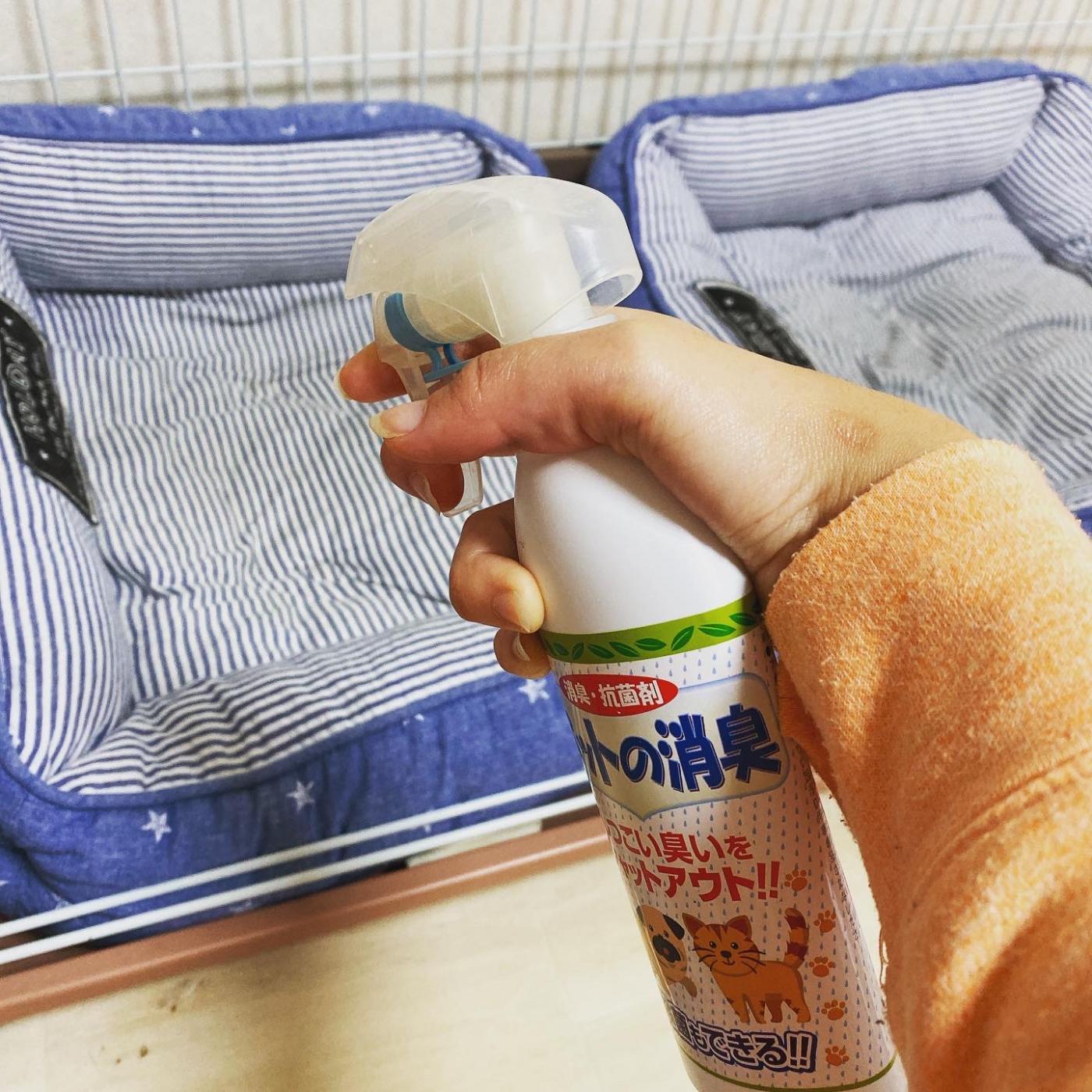 トイレやベット、うちの犬がお気に入りのクッションなどにシュッ!とスプレーしてみました。こちらのスプレーはかけてすぐに二オイが消えるタイプではなく、乾燥と一緒にアンモニア臭などの二オイが消臭されます。また、二オイの原因となるバイ菌も除菌されていきます。