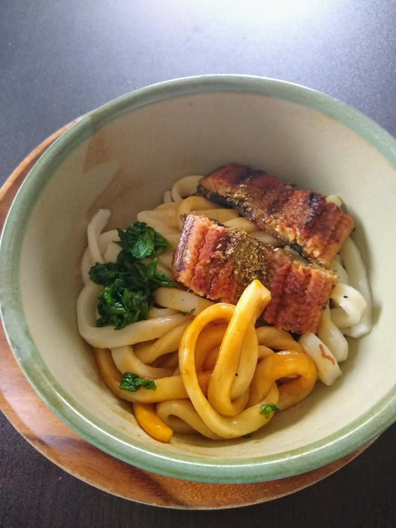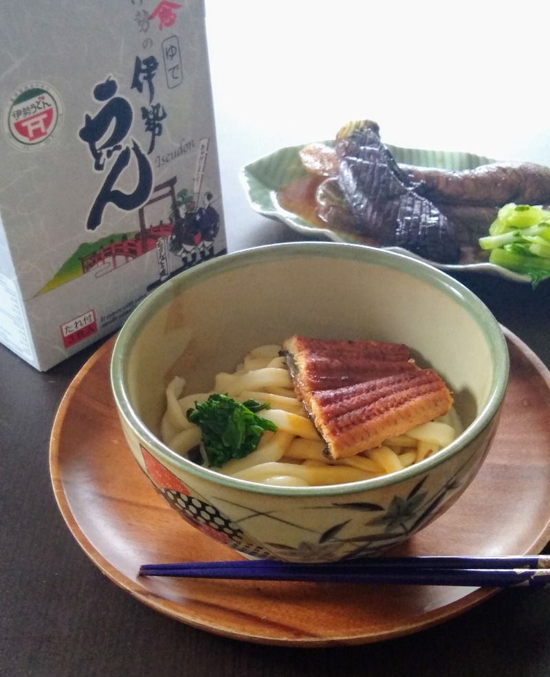 伊勢うどんとうなぎ。合うんじゃないかと思ったけどすっごい合う!両方とも甘めのたれだもんね。