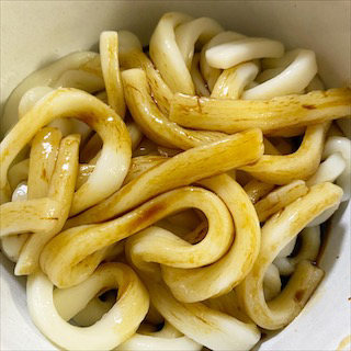 黒色のタレにうどんを絡めていきます