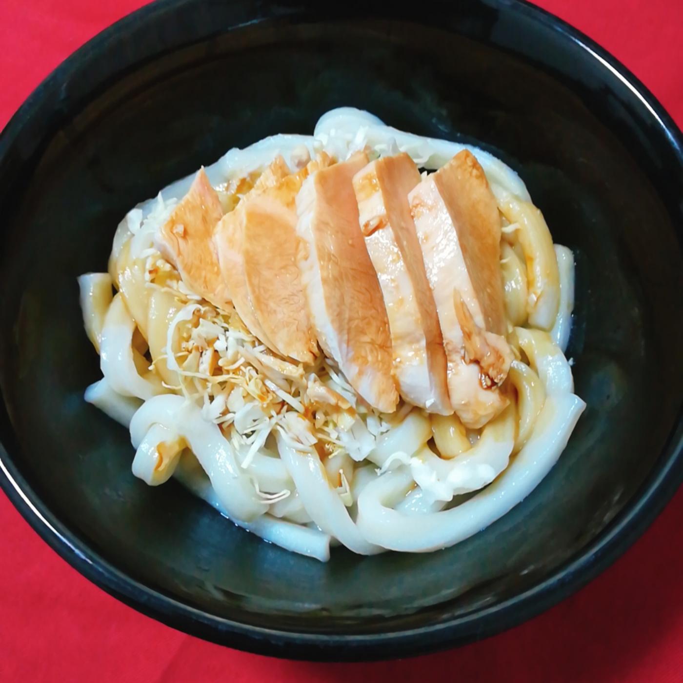 千切りキャベツとスライスした蒸し鶏を乗せても試してみましたが、しっかりとした味のたれがうどんと具材をうまく結び付けてくれて、これまた美味しい✨