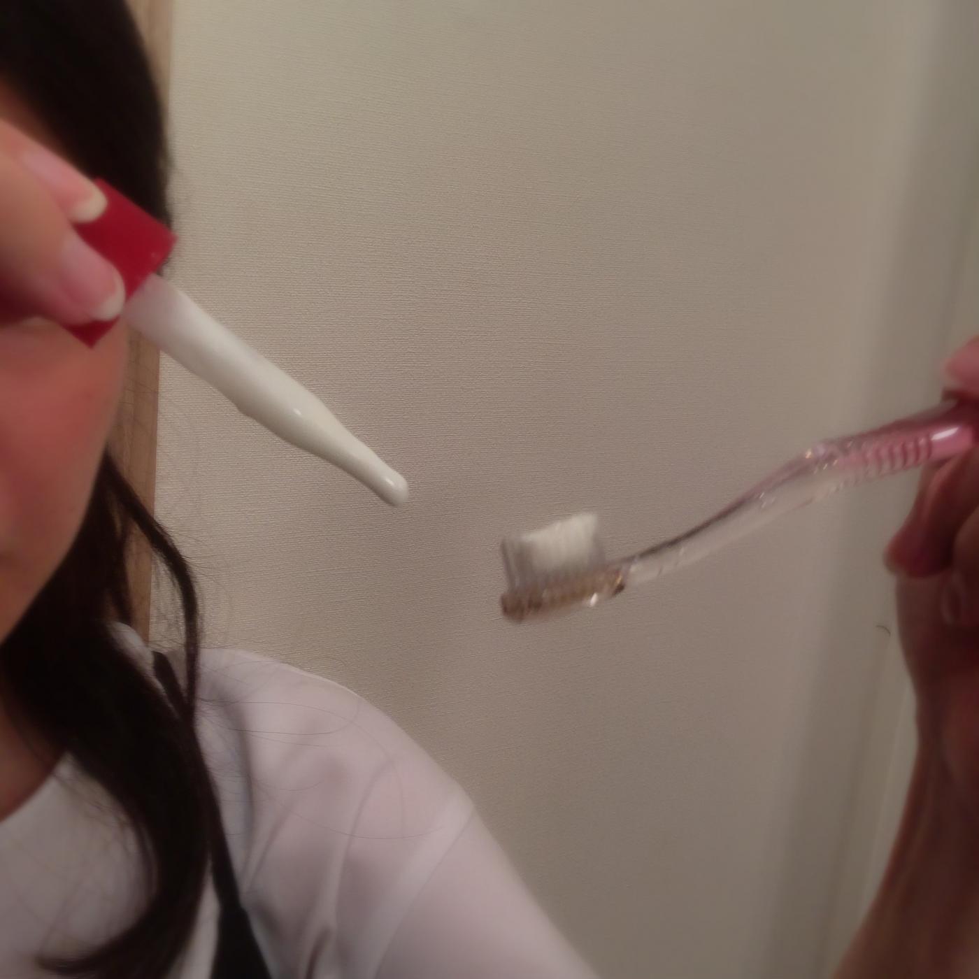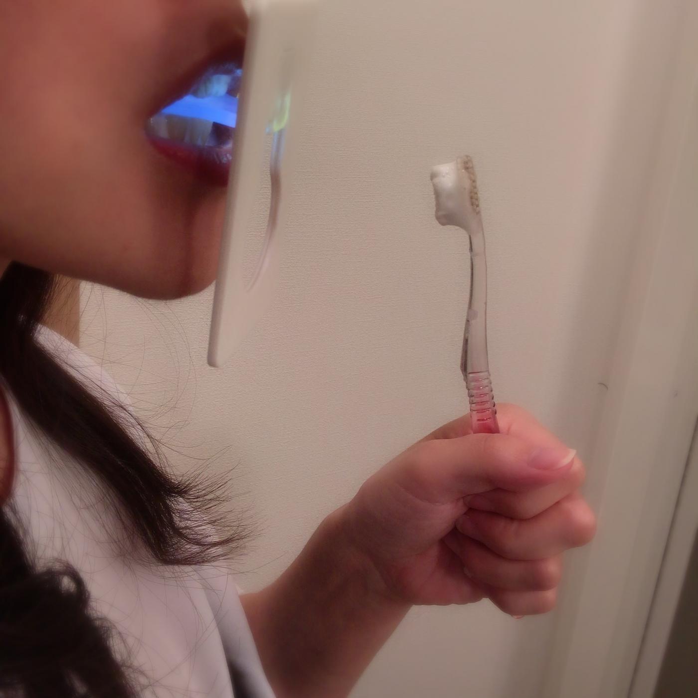 その後LEDライトか、その他太陽光とか電球など、何でも良いので光を歯に当てて1-2分程度放置!(もしくはブラッシングし続けても良いそう)