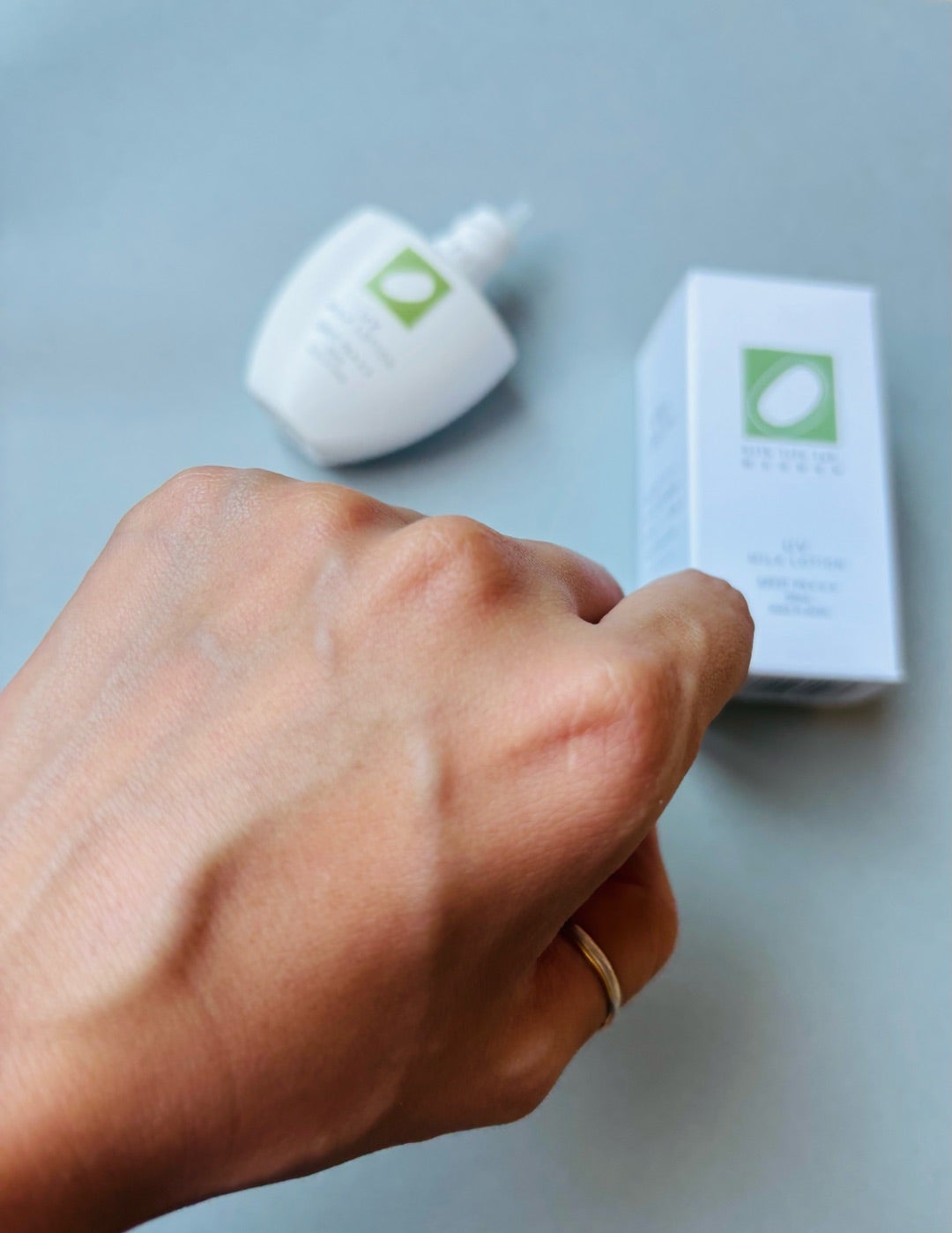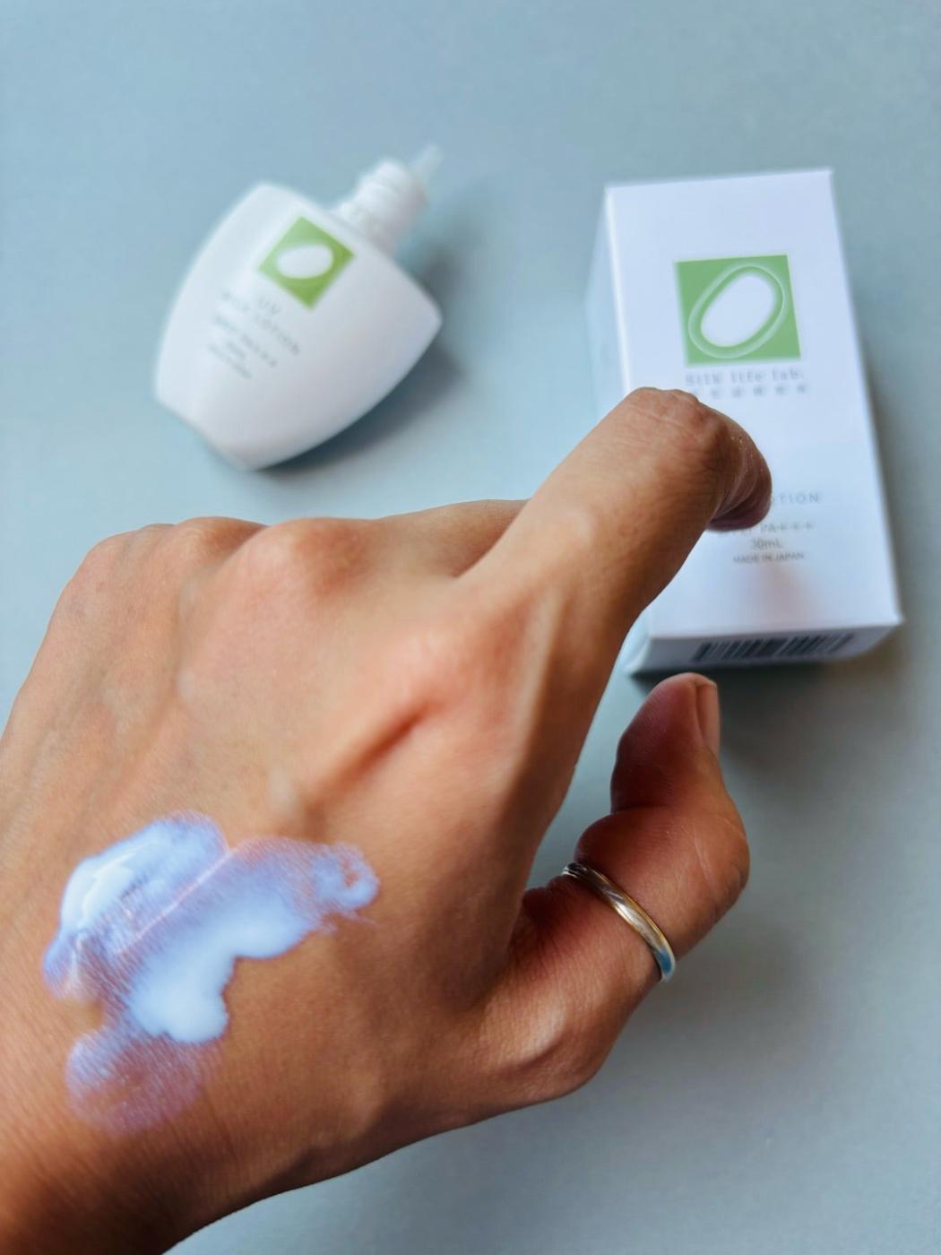 テクスチャーはみずみずしいミルクタイプで、さらっとしています。ミルクタイプの日焼け止めも色々使ったことがあるけれども、その中でもみずみずしさとさらっと感は強めな方だと思います。少量で良く伸びて、すっごく軽い感じです。日焼け止めを塗った後にある、あの重たさが全然ないので、肌に優しい感じがします。
