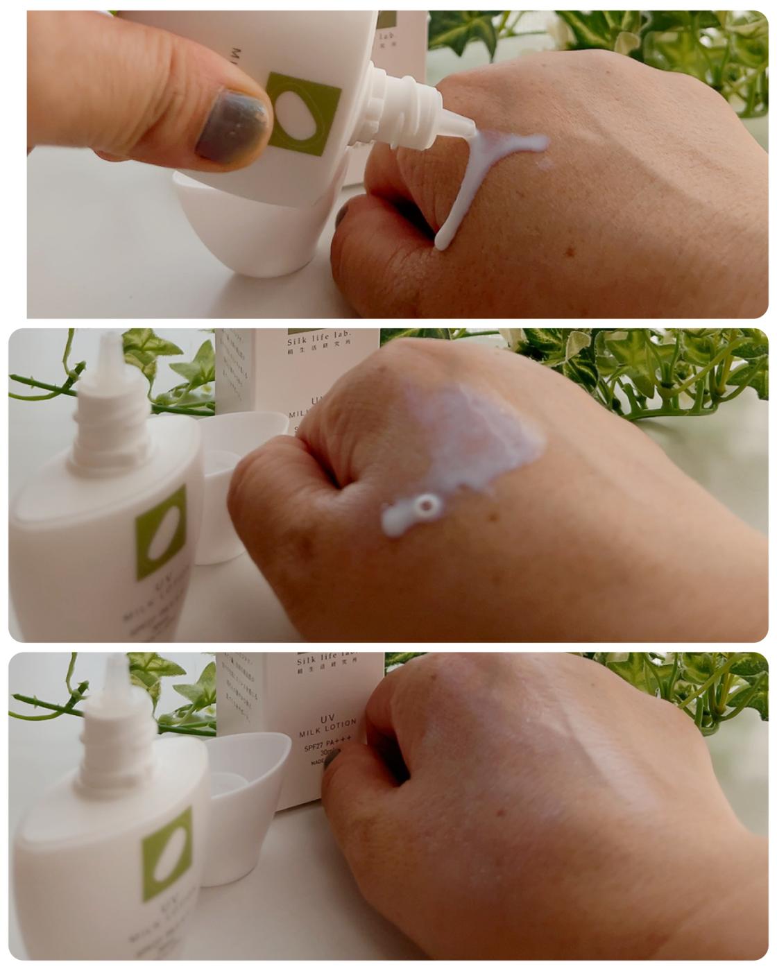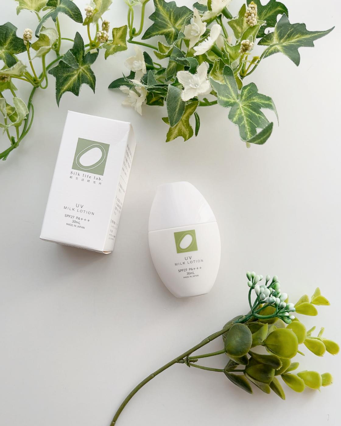 こちらは、みどり繭 由来・天然保湿成分配合※のUVミルクローションになります(※加水分解セリシン、加水分解フィブロイン)