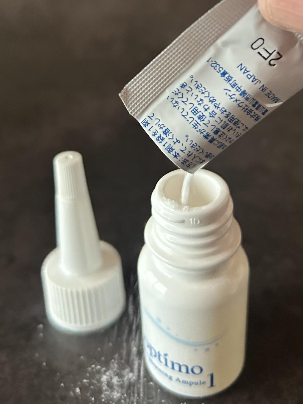 1剤(リキッド15ml)に2剤(パウダー0.5g)を使用直前に溶かして使うタイプ