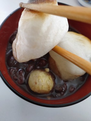 私は焼いたお餅と栗を入れて温かいぜんざいとしていただきました。