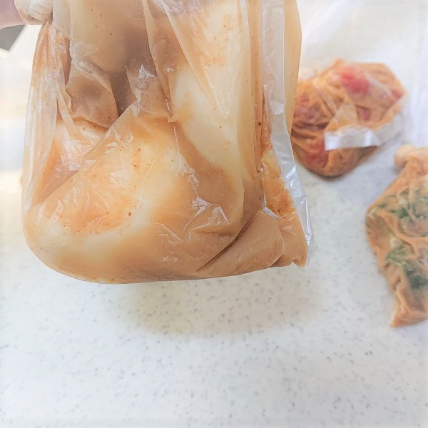ぬか床と違って液体状なので、ビニール袋に入れて揉み込むと良く漬かります。