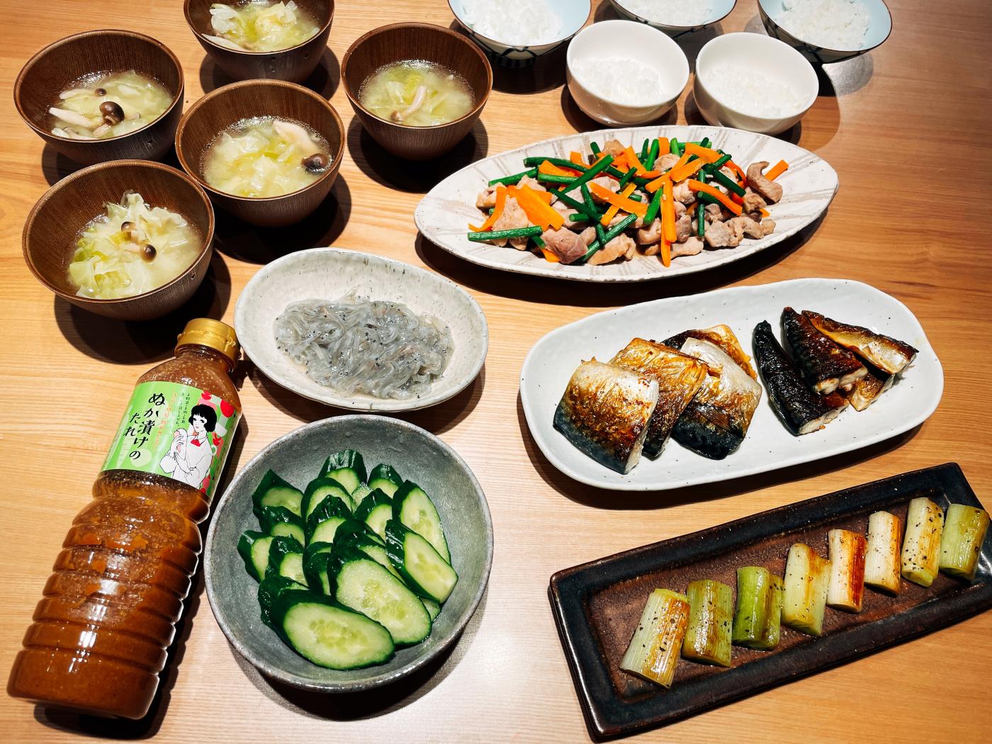 豚肉とにんにくの芽の炒めもの、塩鯖、ネギのオイル蒸し、生しらす、きゅうりのぬか漬け、生姜たっぷりスープ(キャベツ、白ネギ、しめじ)でした。