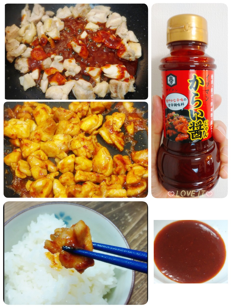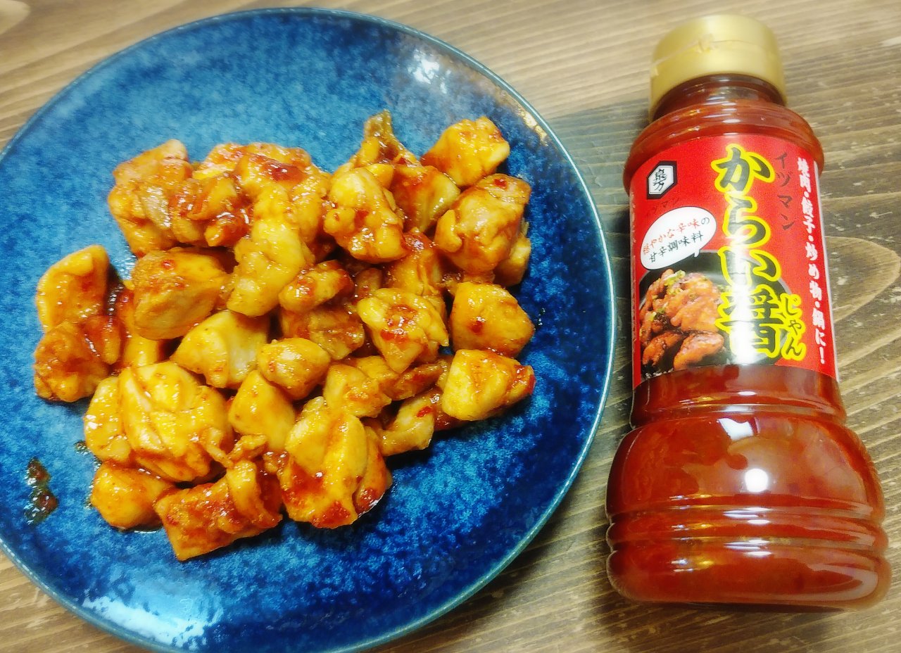 一口大に切った鶏肉をサラダ油を熱したフライパンで強火で焼き、焼き色がつき、中まで火が通ったら、余分な油を捨て、強火にして、イヅマン からい醤を絡めて出来上がり♪
