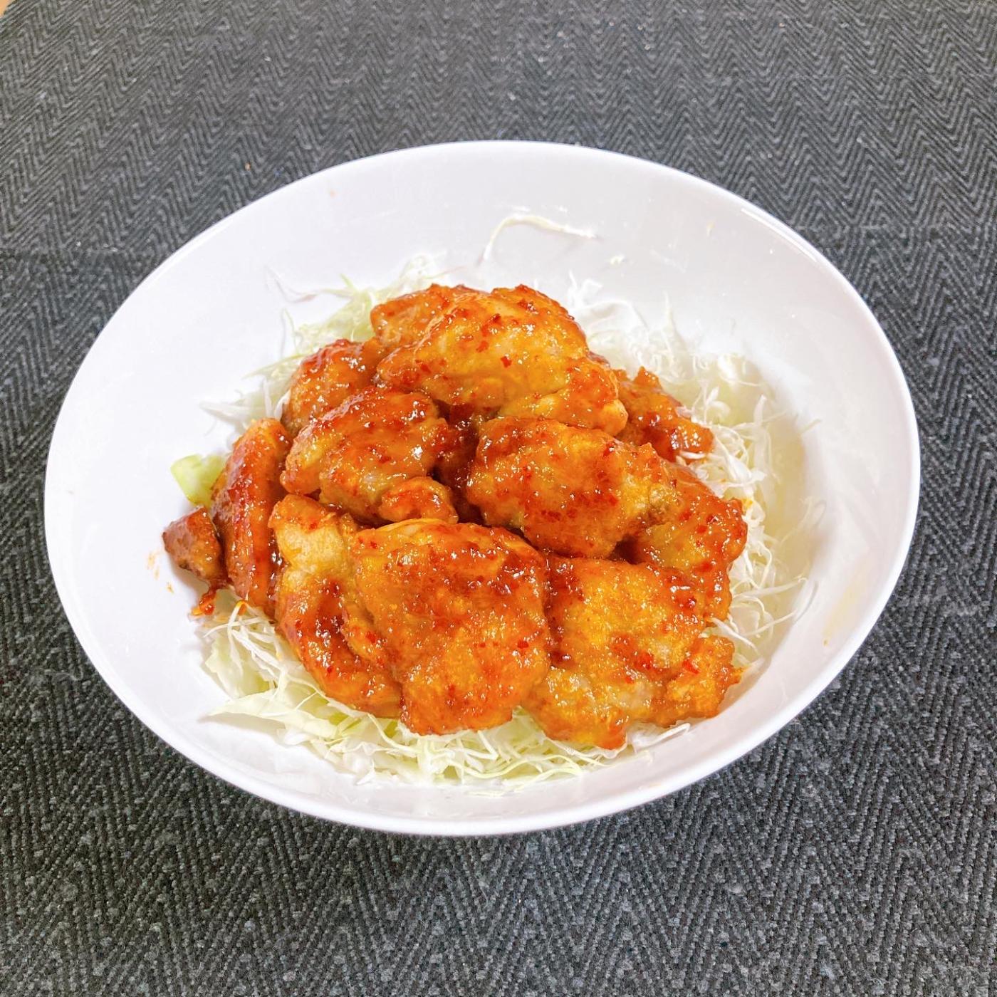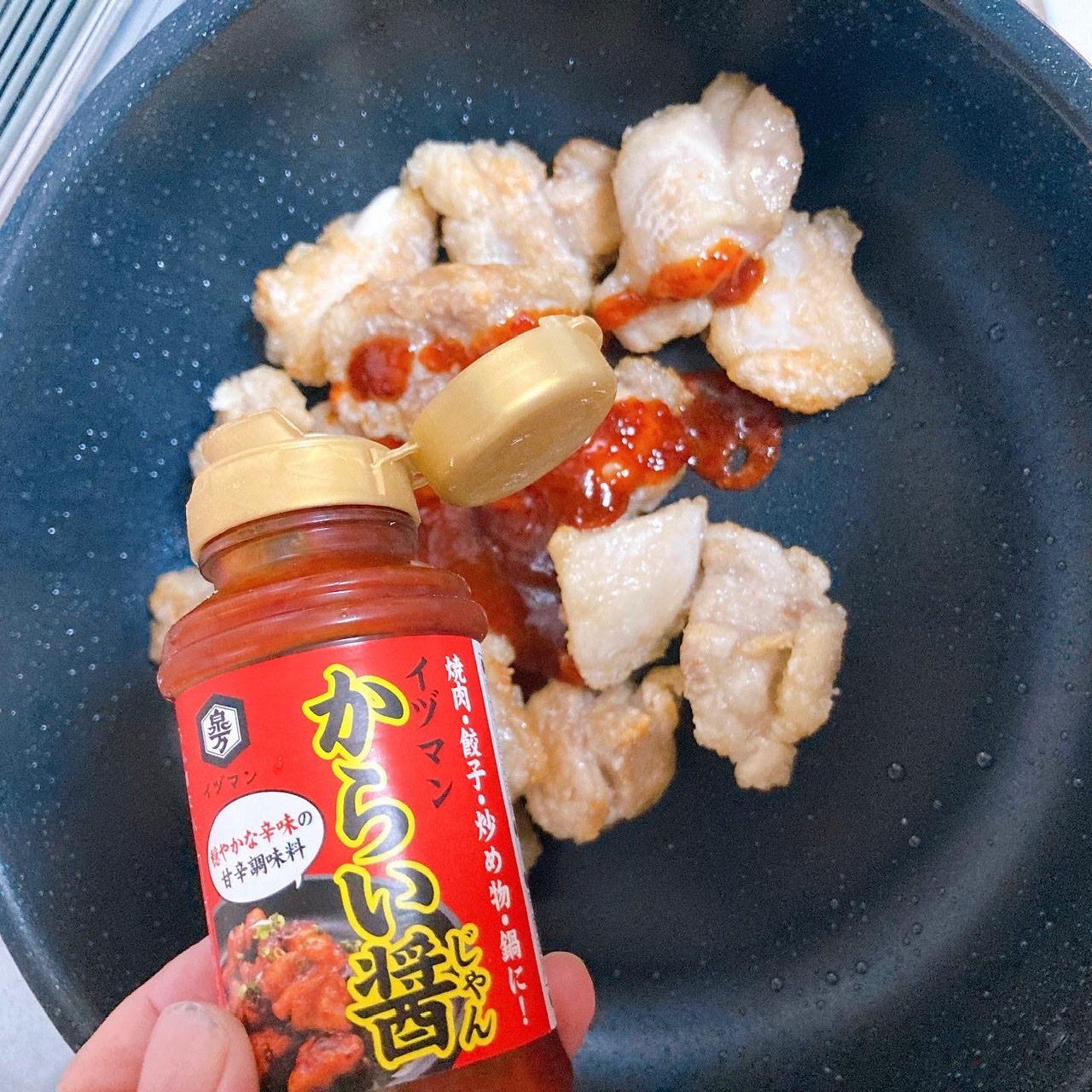 鶏肉に片栗粉をまぶして火が通ったらフライパンのまま、からい醤を絡めて完成👏
