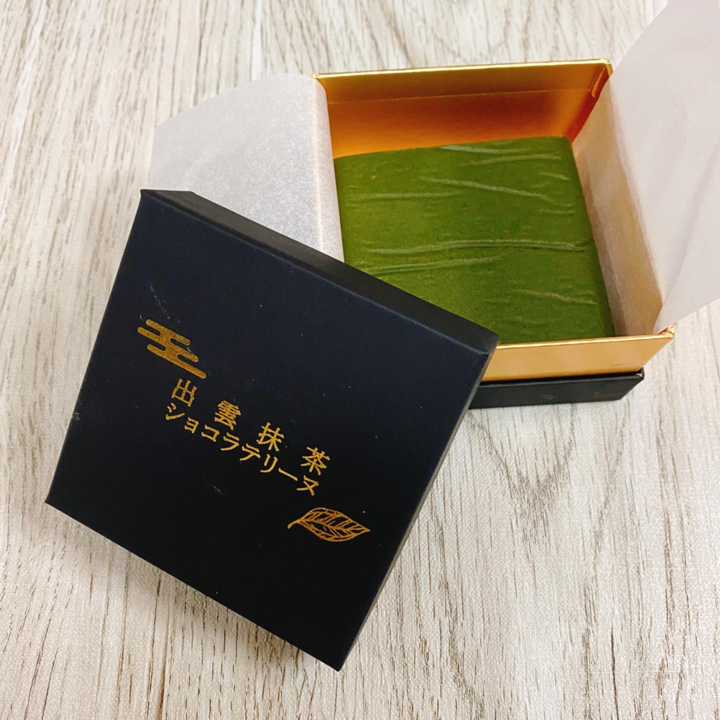 黒い箱に金色の箔で出雲抹茶ショコラテリーヌの