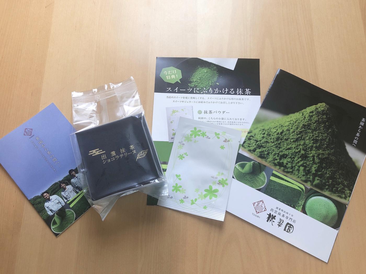 商品の冊子と一緒に、出雲抹茶ショコラテリーヌにかける様の抹茶の粉も入ってましたよ(﹡ˆ﹀ˆ﹡)♡