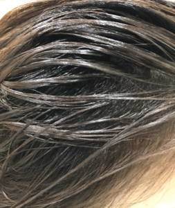 そして、白髪だけでなく、カラーで痛んで金髪になっていた毛先も染まり、髪全体がトーンダウンし、染めた後のようになじんできました。