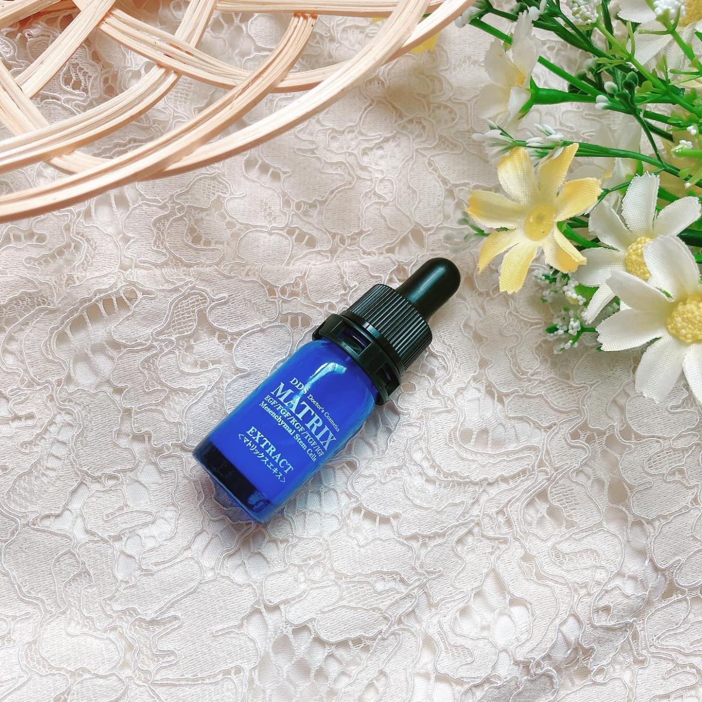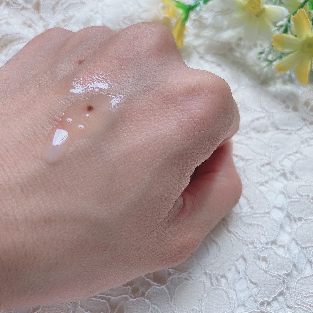 青色の綺麗なボトルの中には、乳白色で少しとろみのある美容液が入っています。