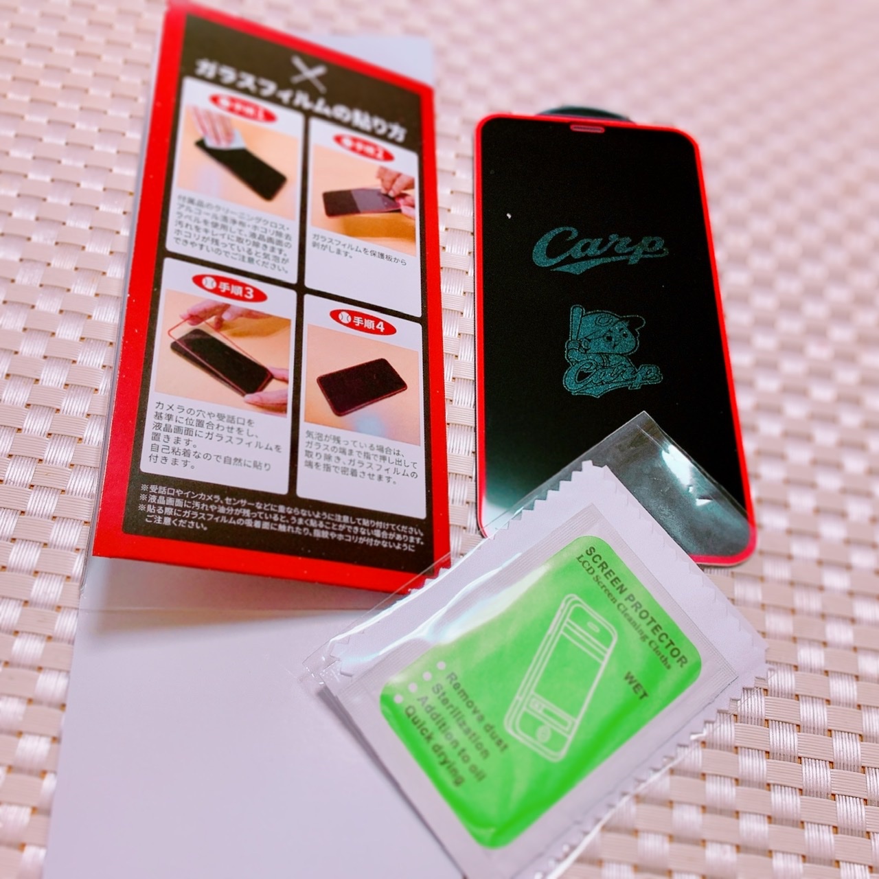 こちらは画面に貼るときに画面の汚れやほこりを取る布などもセットになっていて、