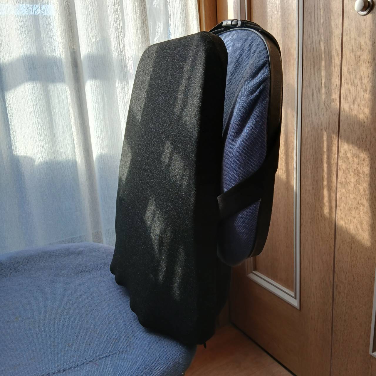 クッションには、ベルトがついているので、椅子の背もたれにつけてセットできます。このクッションに座るわけじゃなく、背もたれに設置して後ろからサポートしてくれる。