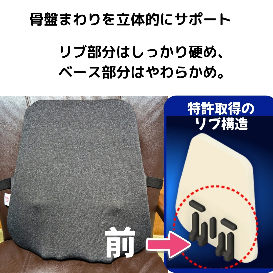このクッションは、骨盤を意識しやすくすることで、骨盤から支える安定した座り姿勢を身体に思い出させてくれる設計になっています。特許取得のリブ構造が、仙骨・腸骨・坐骨・股関節といった骨盤まわりを立体的にサポートしてくれるんです。