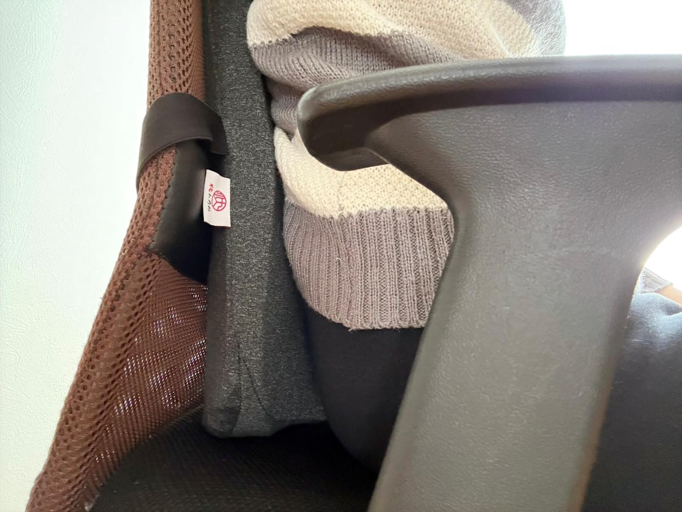 ブラックのようなダークグレーのような落ち着いたカラーのカバーに椅子に固定するベルト付きです。