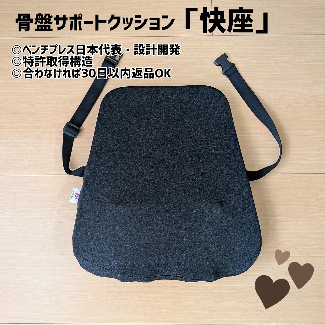 ベンチプレス日本代表選手が監修・設計開発した、骨盤をサポートするためのクッションだそうです。特許取得のリブ構造によって、仙骨や腸骨、坐骨などの骨盤まわりを立体的にサポートし、座るだけで「骨で支える感覚」を呼び覚ます新しい座り心地を体験できる商品らしいです。