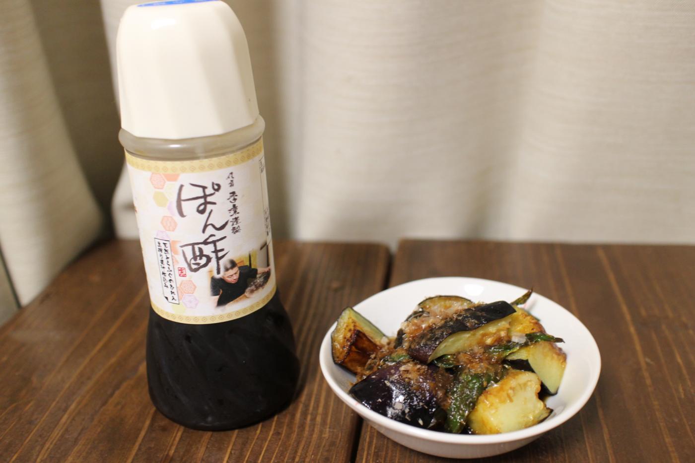 フグの出汁を使っているぽん酢を初めてお試ししました。いつものぽん酢とは違います。いろんなぽん酢を食べてきましたし、どれも柑橘が違ったり味も様々でその調味料の良さがそれぞれあるんだけど、このポン酢は他のものともまた違いました。ぽん酢として色々使用してみました。ホヤの酢の物にしたり、海藻の酢の物にしたり、野菜の揚げ浸しには茄子や万願寺唐辛子やみょうがを素揚げしたものに鰹節をかけてその上からぽん酢をかけて浸しておいてから食べたりもしました。野菜の旨みと良く合い、さっぱりとした酸味のあとに、鼻に抜けるフグの出汁を感じるような気がします。しっかりと美味しい出汁のきいたぽん酢なんです。冷蔵で届いたのにも品質保持の理由がありました。是非皆さんにも食べてもらいたい美味しいぽん酢です。