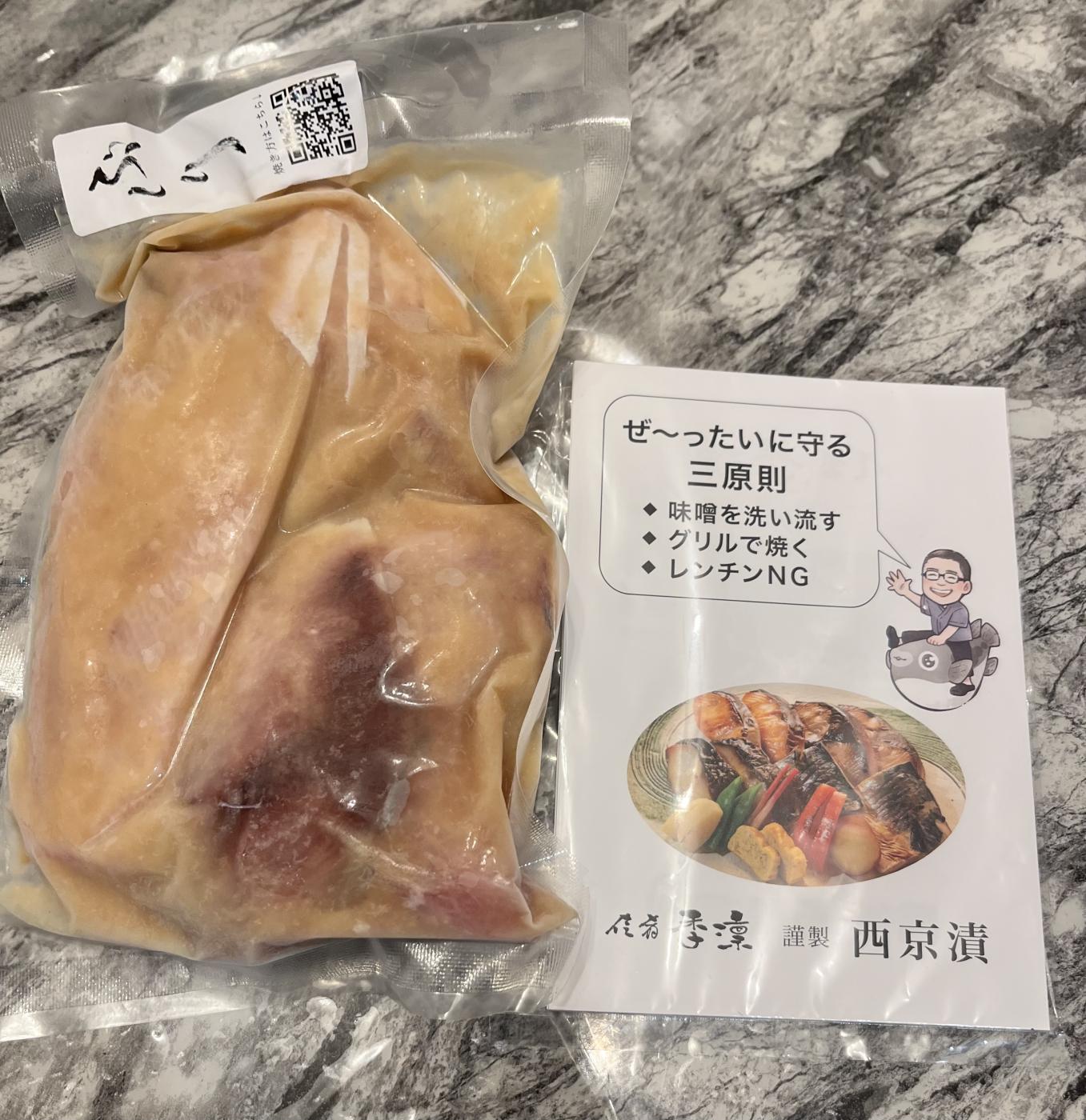 こちらは冷凍された状態でお家に届くお店の西京漬でして、今回食べさせていただいたお魚は銀鱈(ぎんだら)、サーモン、鯖(さば)、鰤(ぶり)の4種類の中の1つ、鰤(ぶり)です。