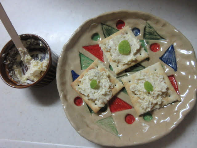 クラッカーにゆずのまんまバターを乗せて、最後に自家栽培のミントの葉を加えます。