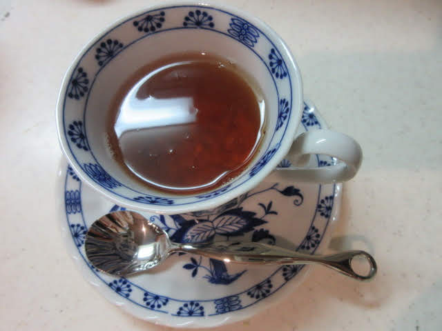 続いて、2品目のゆずのまんま紅茶です。ティーカップに淹れた紅茶とダイス状に刻んだゆずのまんまを用意致します。紅茶にゆずのまんまのダイスを適量加えます。