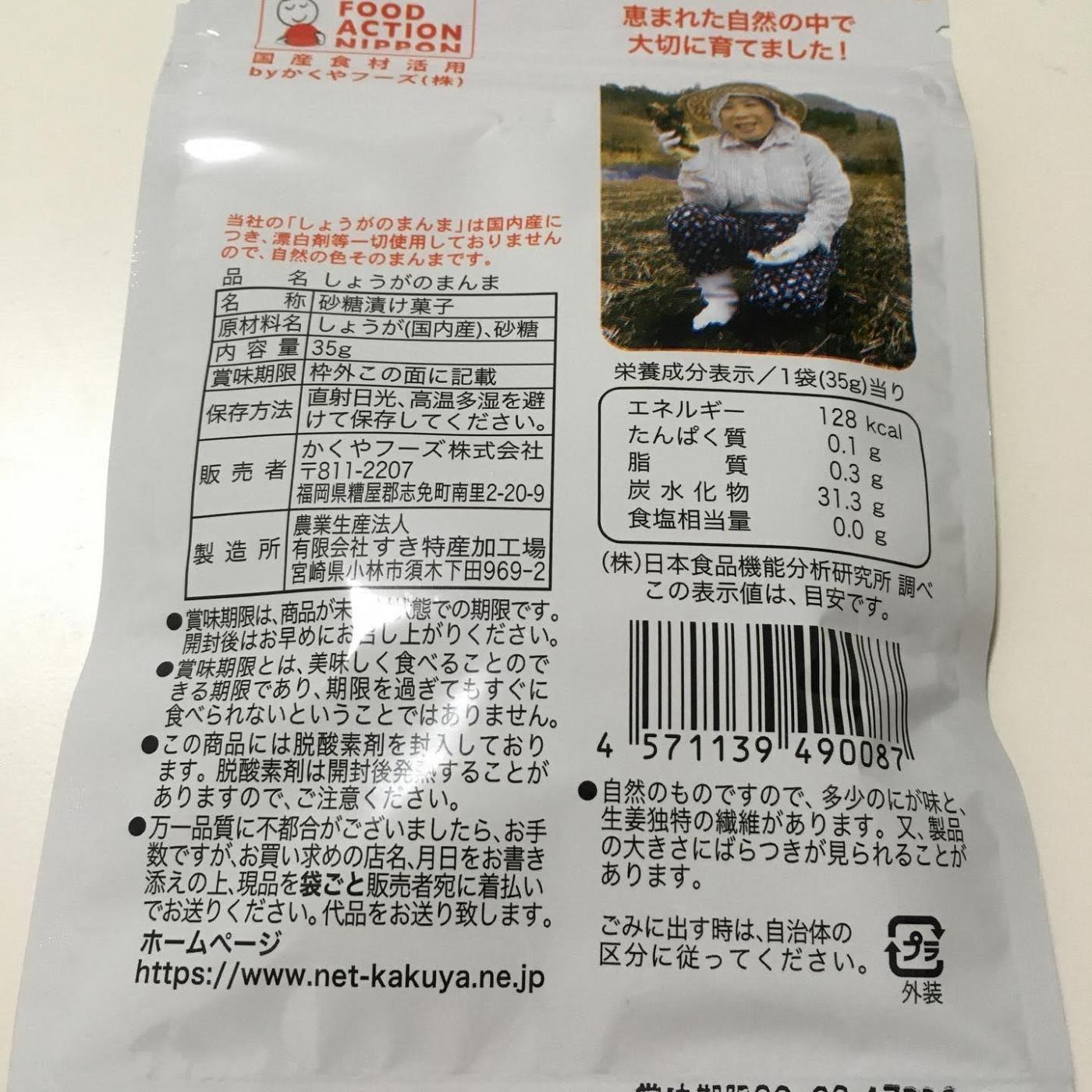 食べると生姜の風味が広がるのを感じられて、体もじんわり温まります。国内産のしょうがを使っていて、無着色無漂白です。パッケージの裏面にもそのこだわりについて書いてあり、生産者の方の写真も載っているので安心して食べることができます。自然の色そのままで、一つひとつ大きさが違いました。すぐに全部食べきれなくても、チャック付きなので持ち運ぶこともできるのが助かります。冬場には特にバッグに入れておきたいお菓子だと思いました。今の時期もエアコンや冷たい飲み物などで冷えを感じることがあるので、お菓子で手軽にしょうがを食べられるのは嬉しいです。味も、砂糖の甘味がほどよく生姜の風味を邪魔していないのが良かったです。