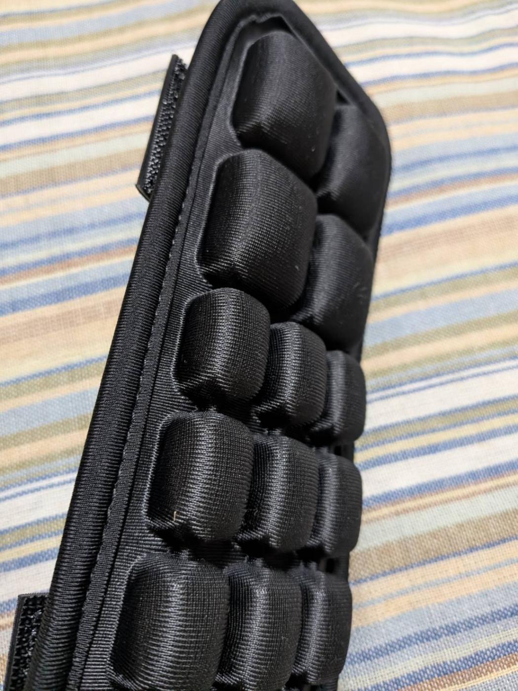 ベルトにはプッシュポップみたいに空気ボックスがいくつもついていて、中の空気量を調整することもできるそうです。空気が多めだと、荷物と体の隙間も開くので持ちやすいかも。