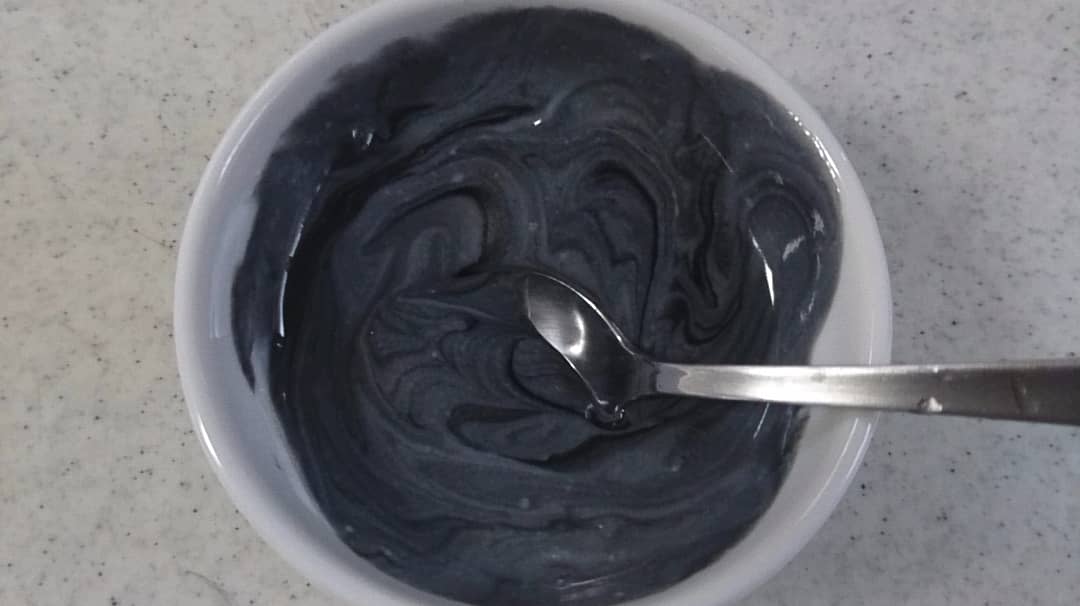 実際にプレーンヨーグルトにふりかけてみましたがサラサラとした超微粒子パウダーなのでヨーグルトと混ぜ合わせるとダマになりにくくて真っ白だったヨーグルトがこんなにもキレイな真っ黒になりました。