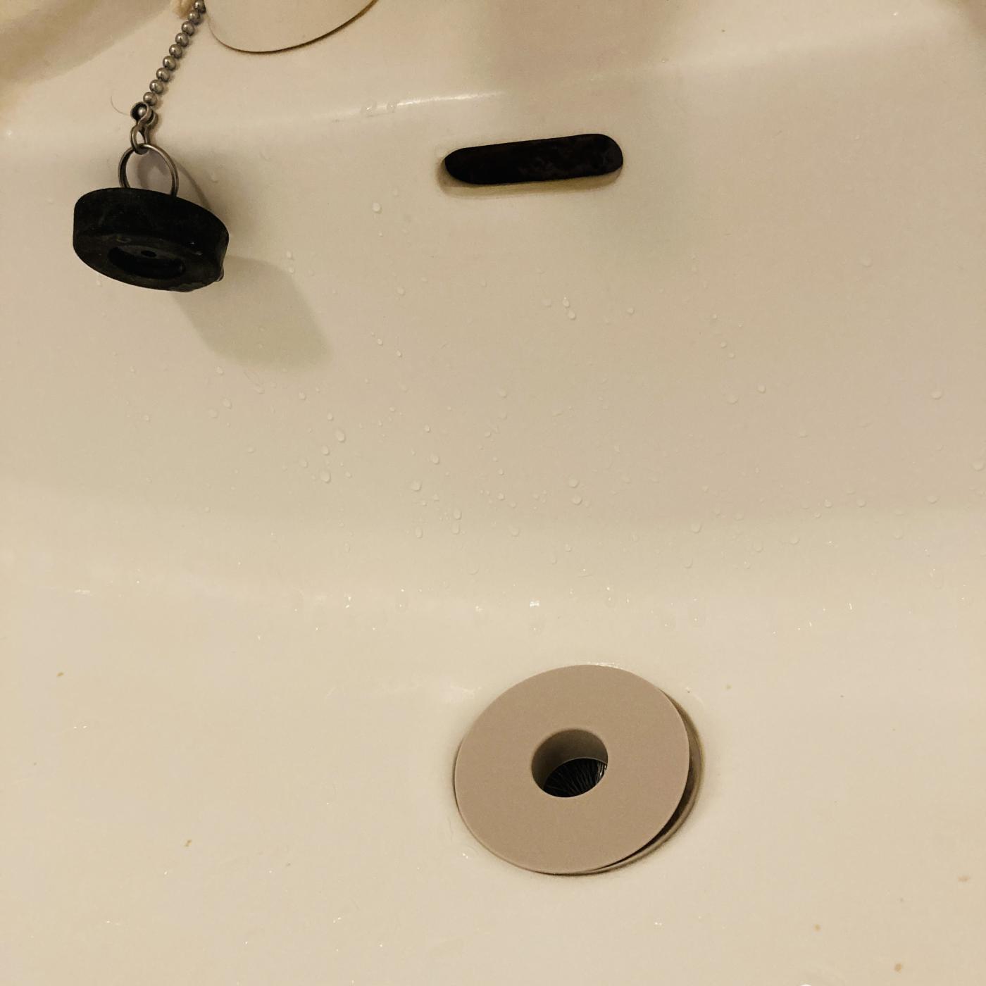 これ、金属製の今までのに比べてメリットたくさん。まずは価格が安めだしさびないですね。我が家のドレッサーにはすっきりぴったり装着で、色味がくすんでてかわいらしいので悪目立ちせずにすっきりなんですよ。いい感じ。たぶん普通の家の洗面台なら問題なく使えると思います。クラゲのような見た目は、もち上げると現れます。かわいらしいので、お掃除のときに不機嫌にならなさそうですね。