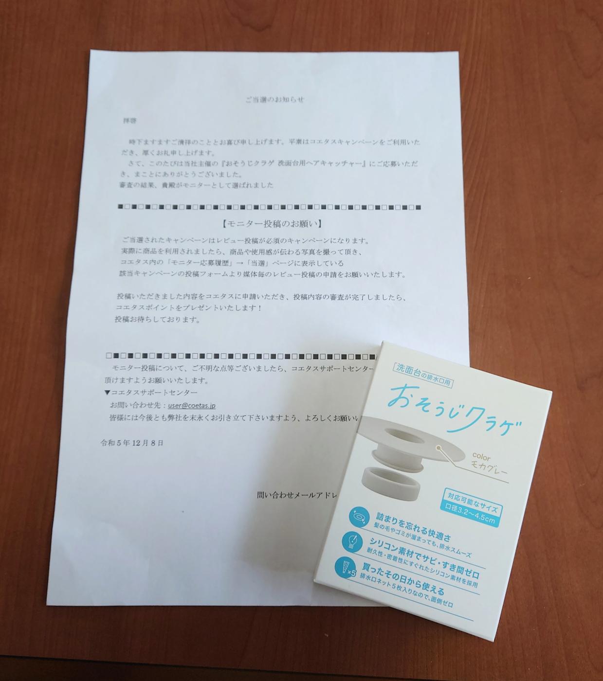 コエタスのモニターキャンペーンでご提供いただいた おそうじクラゲ 洗面台用ヘアキャッチャー につ...