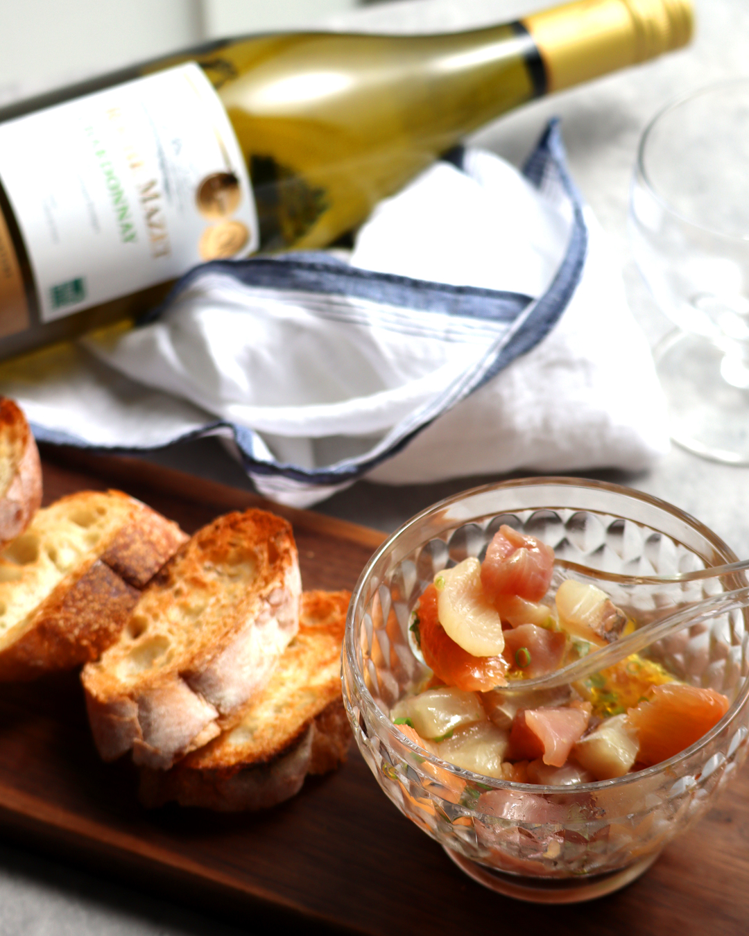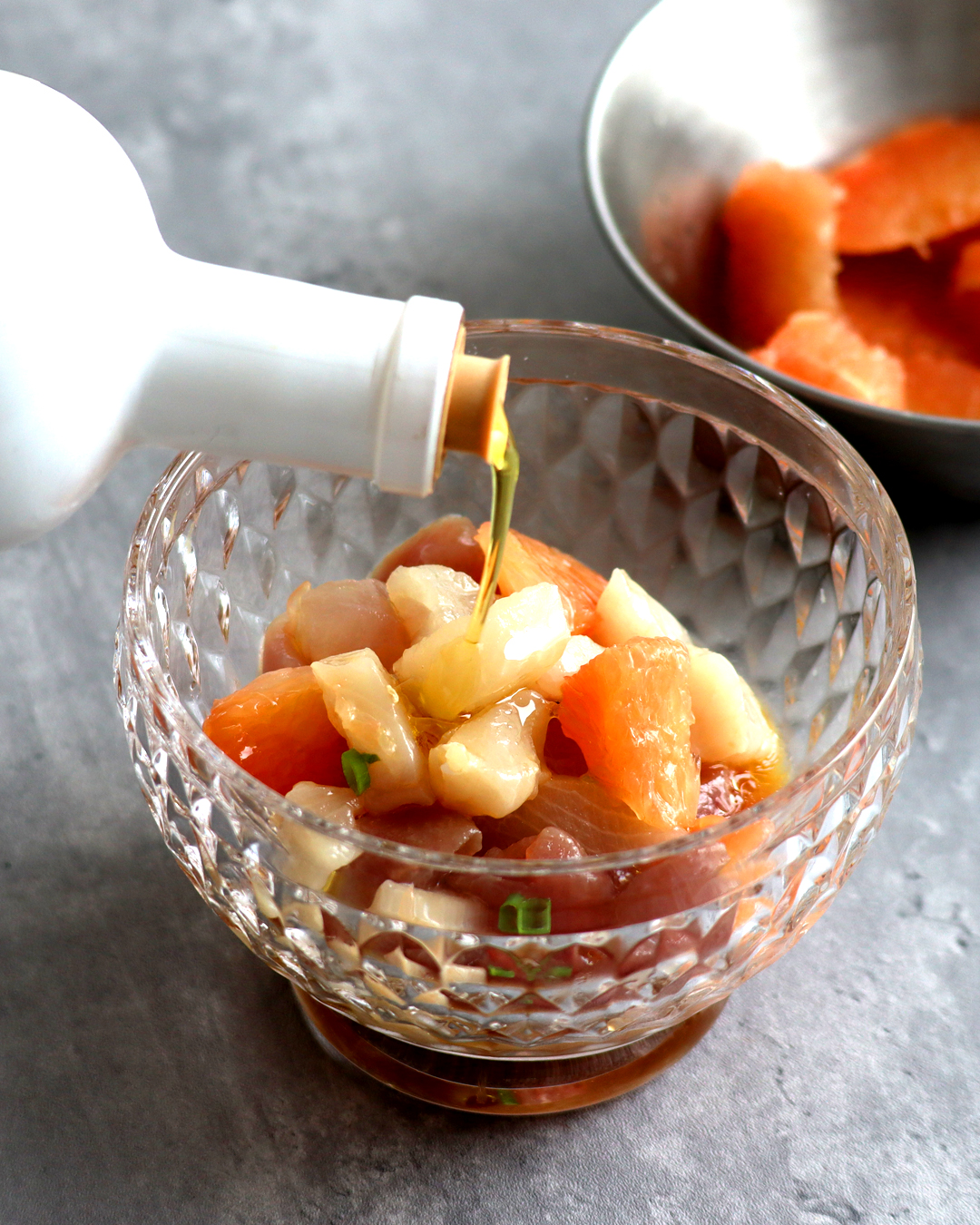 グレープフルーツの果汁と果肉を加えることで、さっぱりとした酸味とほのかな苦味が魚の旨みを引き立ててくれます。仕上げにオリーブオイルを垂らし、バゲットにトッピングするだけでおつまみにもぴったりの一品。