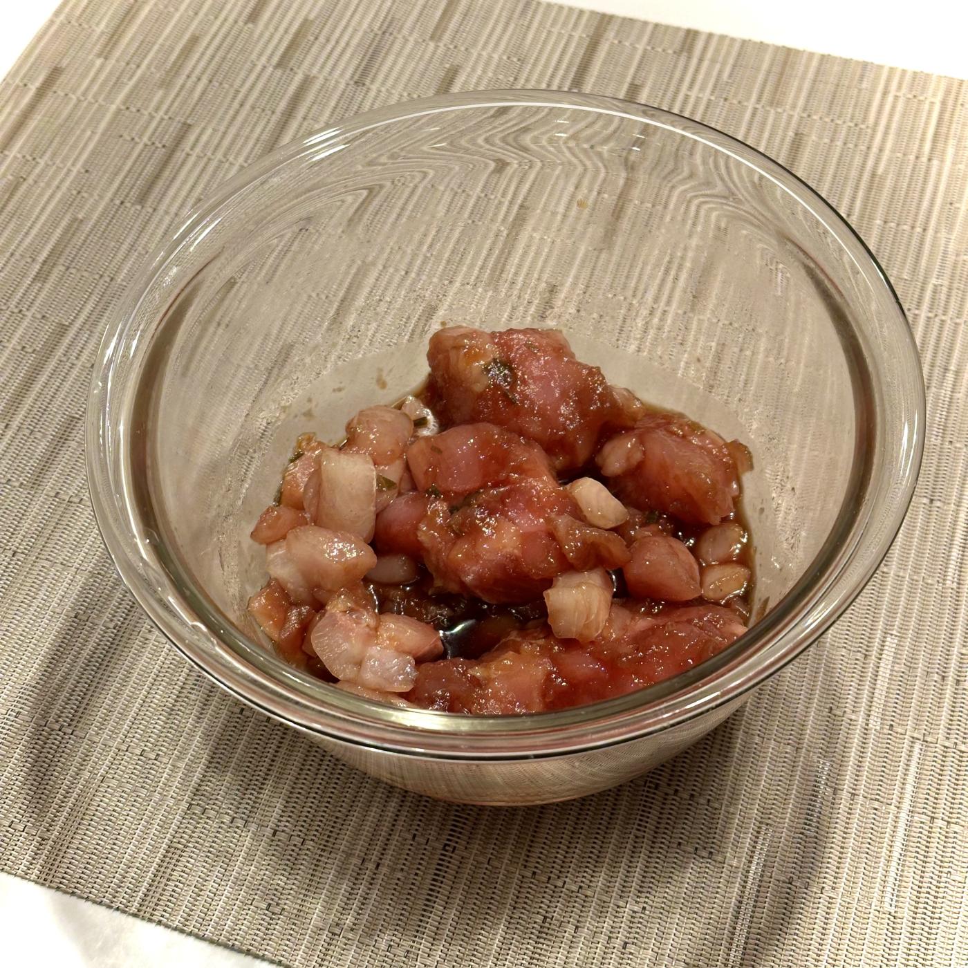 -60℃超速冷凍技術で届けられたヒラマサ・マグロ・カツオを、ボウルなどに溜めた水に10〜20分ほどつけて解凍し、付属のタレで和えるだけで簡単に完成します。