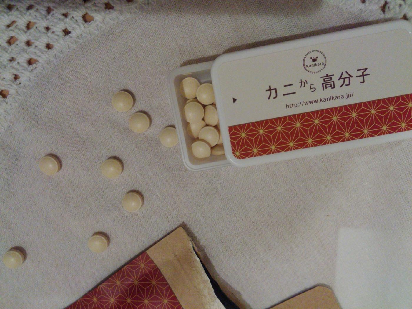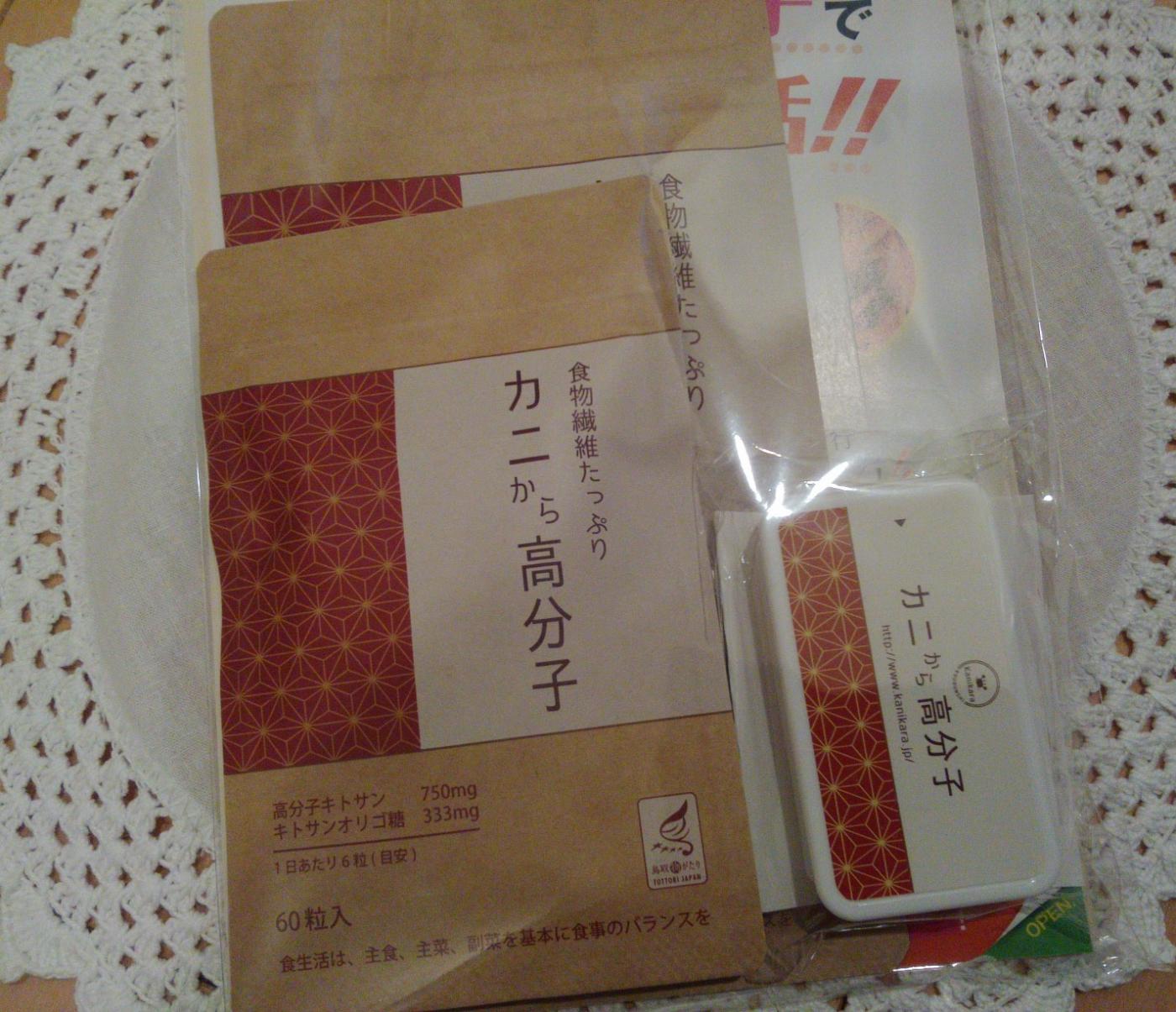 カニやエビの殻を原料にした食物繊維のキトサンが体の中で脂分やコレステロール、プリン体、塩素など、「様々な余分なものに吸着」して吸収を防いでくれるというキトサン配合のサプリ「カニから高分子(高分子キトサン&キトサンオリゴ)」を飲んでいます。パッケージがかわいい!