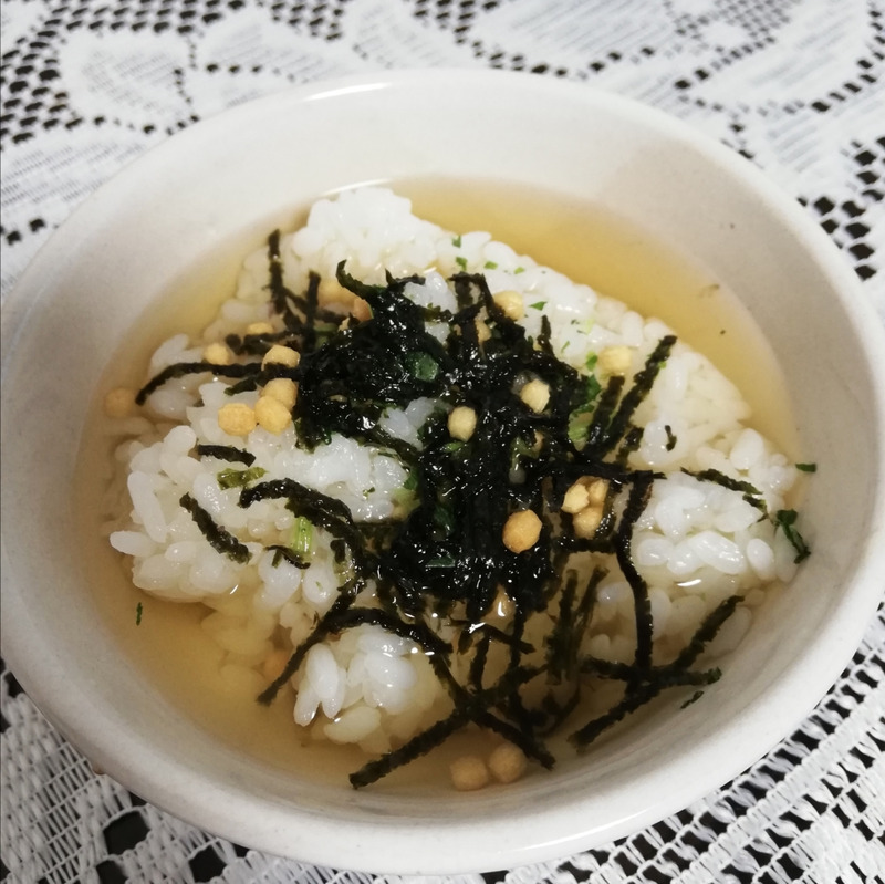 水とだしパックを入れたカップを電子レンジで1分強あたためて、ごはんにかけるだけで完成です。