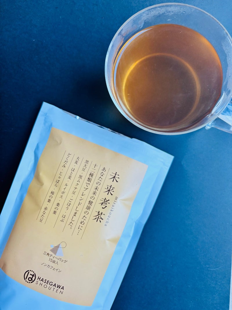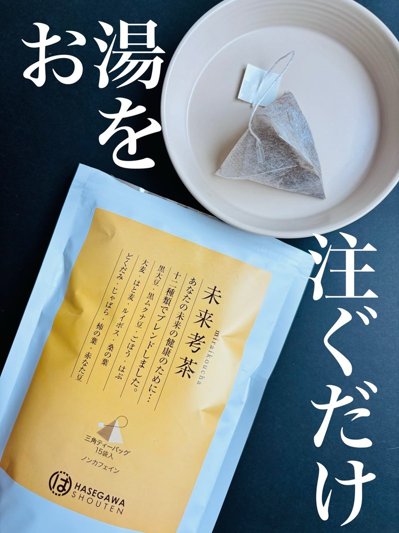 国産黒大豆をベースに12種類の健康素材をブレンドしたノンカフェインのお茶、未来考茶。