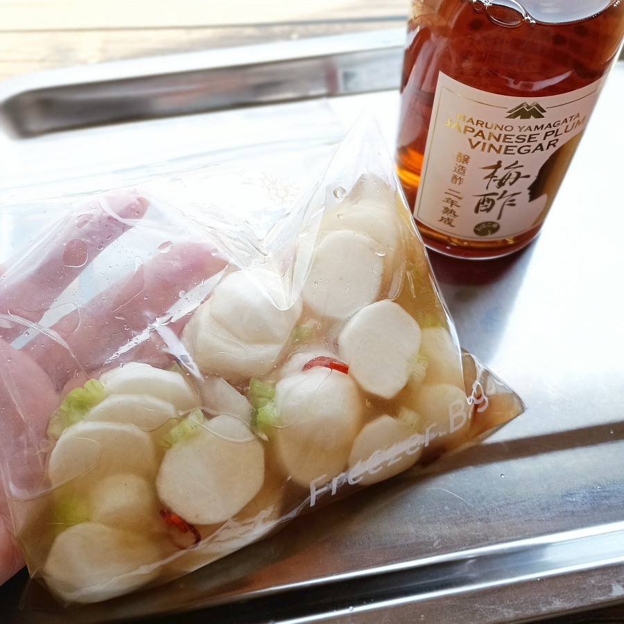 小カブの皮をむいて薄く切り、全ての調味料と一緒にフリーザーバッグに入れて軽く揉み、冷蔵庫で