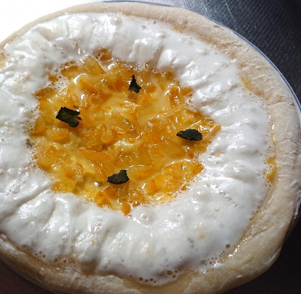 今回このスイーツピザ、ホワイトチョコとなるとオレンジのピザお試し!!