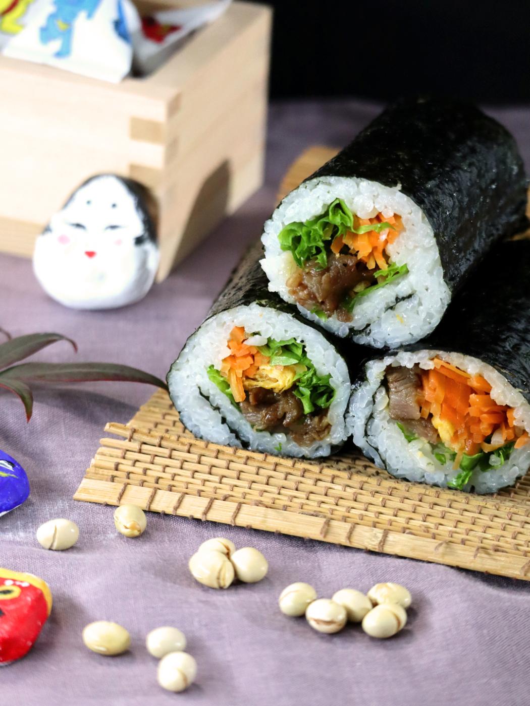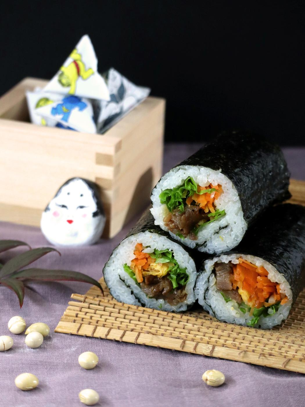 門崎丑の焼き肉をたっぷり巻き込んだ特製恵方巻を作りました。