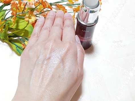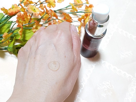 洗顔や化粧水で肌を整えたあとに、こちらの花丹を1〜2プッシュ手のひらに取り、顔全体にこすらないよう広げていきます。