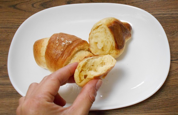 この塩パン、かなりずっしりとしていて中がしっかり詰まっている感じなので、今ぐらいの時期だと1時間では中心部分が解凍しきれていませんでした。