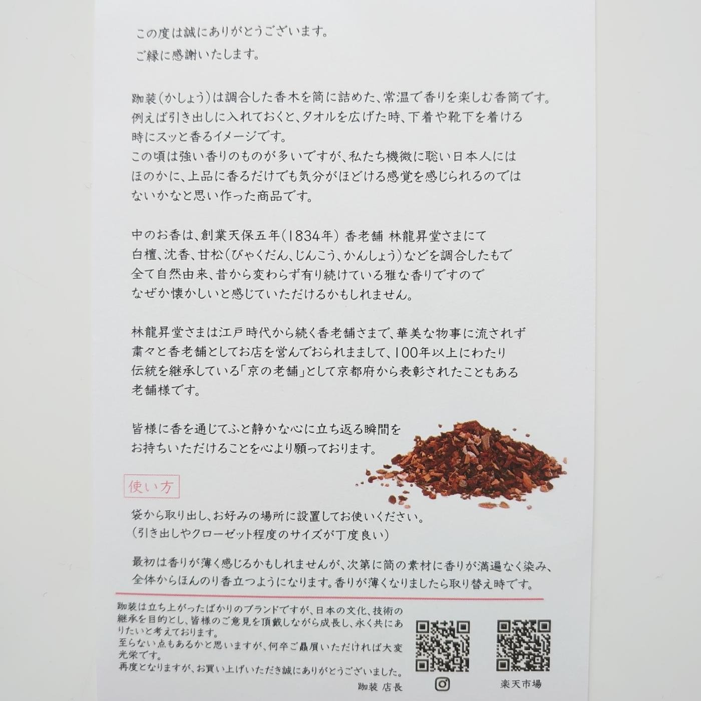 跏装のお香は創業天保五年(1834年)、江戸時代末期から京都で薫物線香、焼香、伽羅や沈香などの御香を販売している「香老舗 林龍昇堂」のお香をご提供いただいています。
