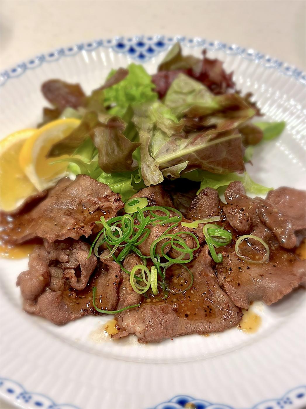 前日から冷蔵庫で解凍しておいた牛タンは、キッチンペーパー等で水分をふき取ってから調理します。
