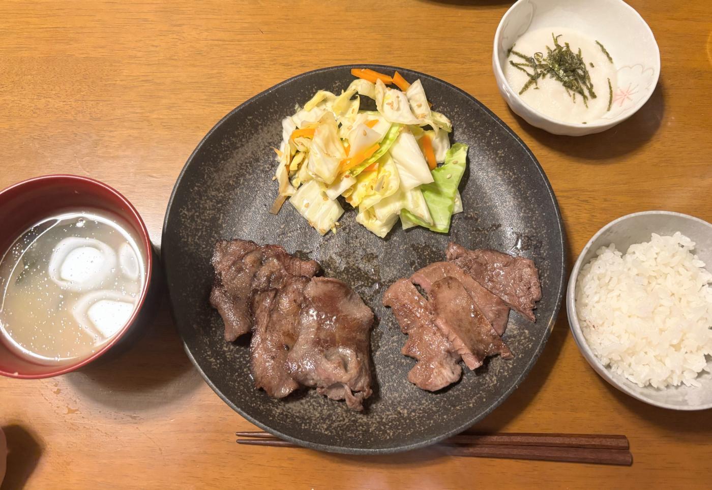 2種類の牛タン盛りにキャベツの浅漬け、ごはんと味噌汁、とろろです!