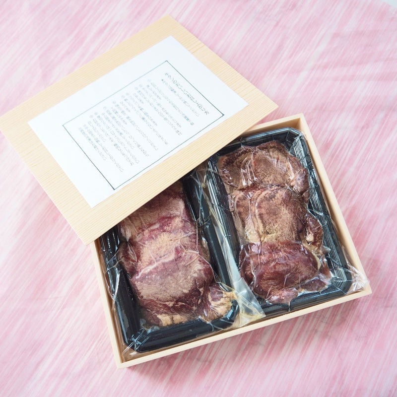 高級感ただよう可愛らしい水色の風呂敷に包まれた木箱風の箱に牛タンが2種類入って届きました!冷凍の状...