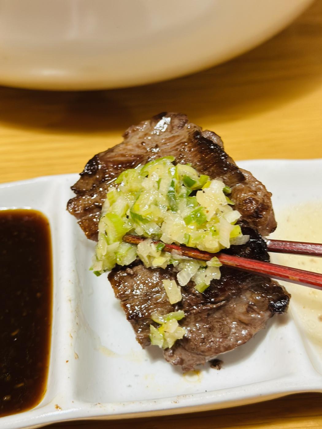 はじめに厚切りを食べましたが、柔らかさとコリコリとした食感もよく、とても食べ応えがありました。ネギ塩ダレでいただきましたが、濃厚なお味を楽しめました。