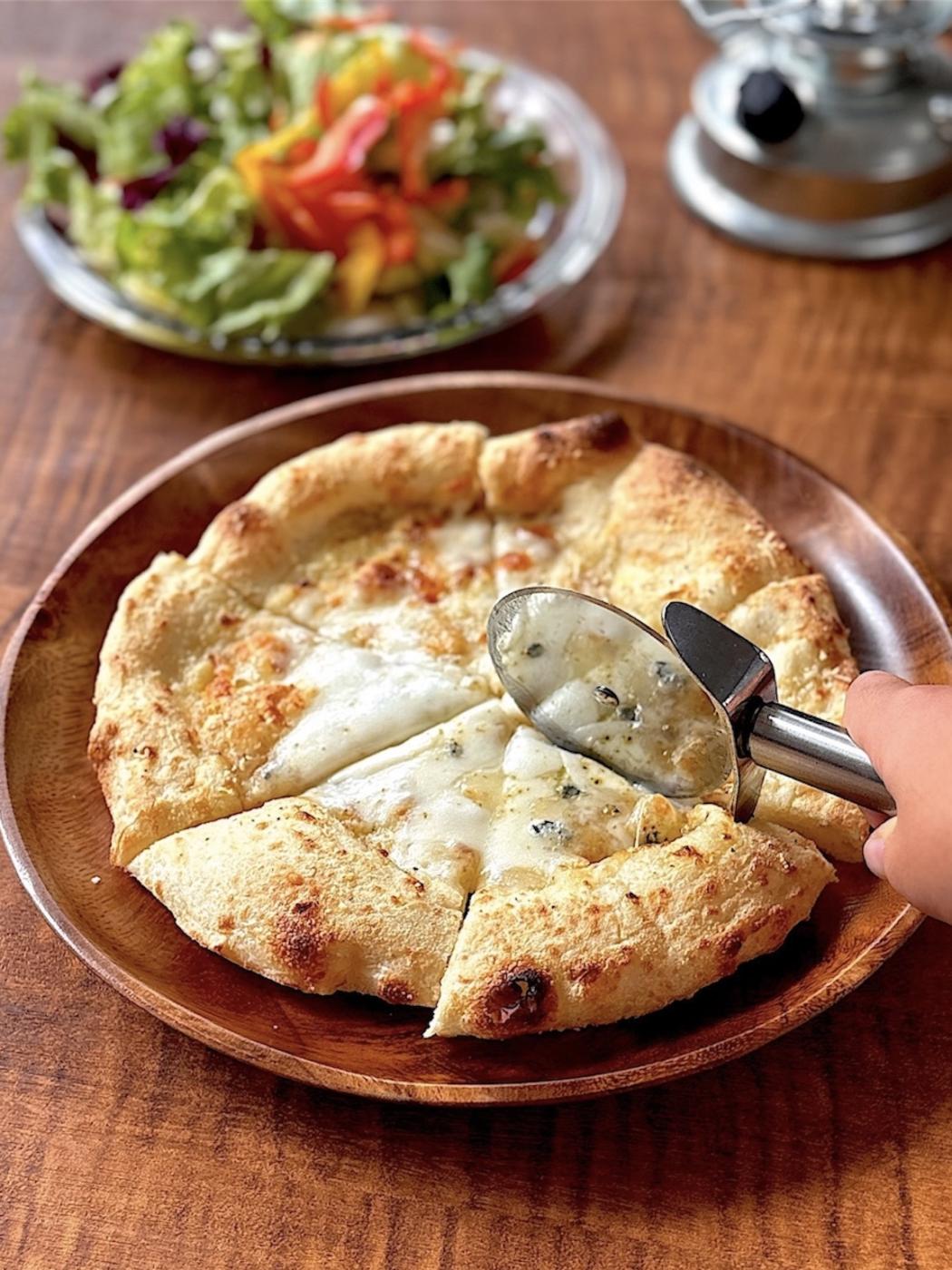 もう一種類の阿蘇産4種のチーズピザは、焼いている時から濃厚な香りがすごかった!チーズ好きにはたまらない!濃厚なコクと、時折感じる塩気がたまりません。我が家は子どもがいるので蜂蜜をたっぷりかけて。蜂蜜掛けると、またチーズが美味しさアップ✨大好きな食べ方。これはそのまま食べれば、ワインのお供にもぴったりです🍷